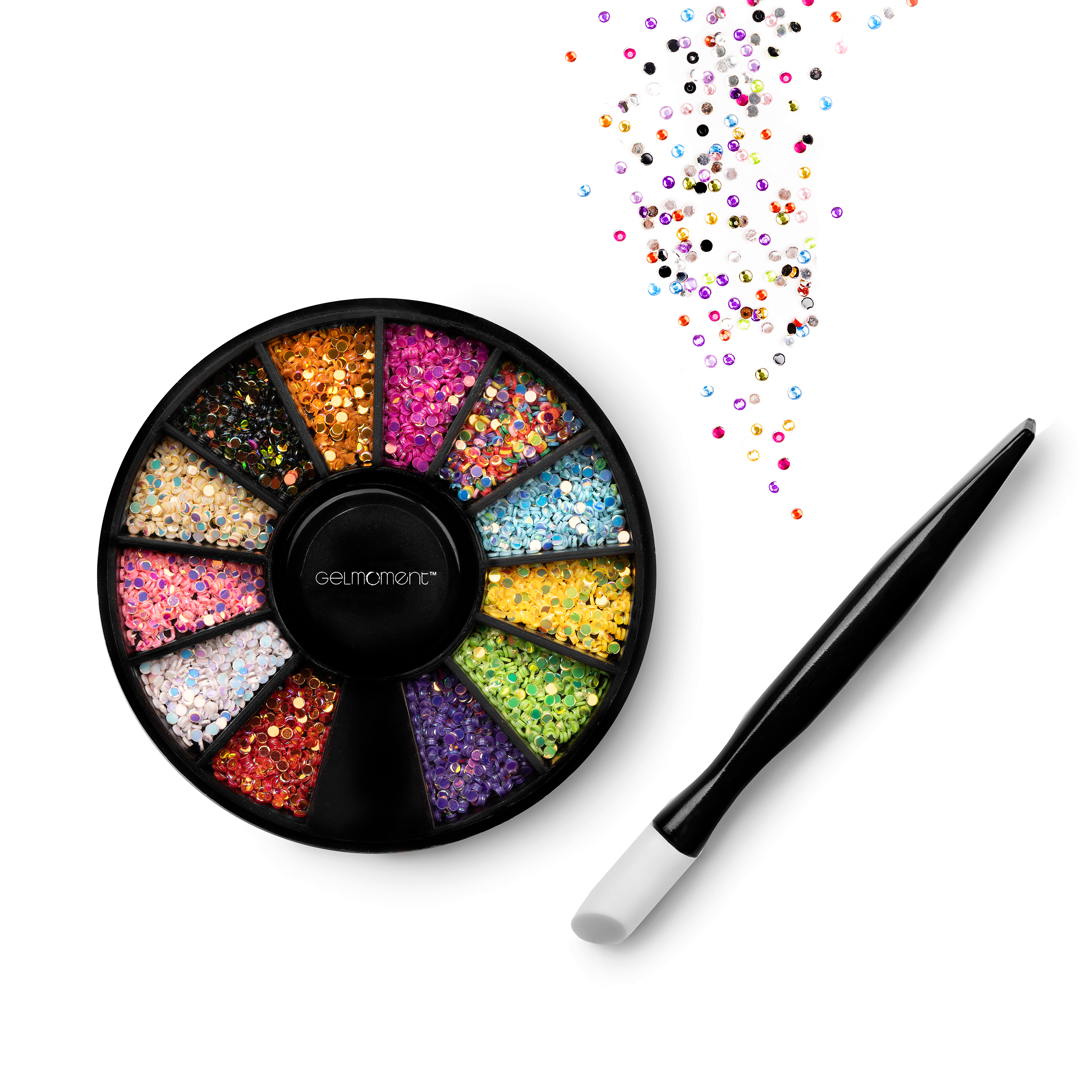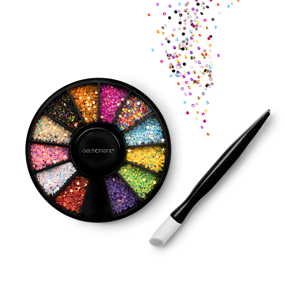Iridescent Circle mini jewels comes with 12 colours and an applicator stick, and comes packaged in a GelMoment organza sachet.