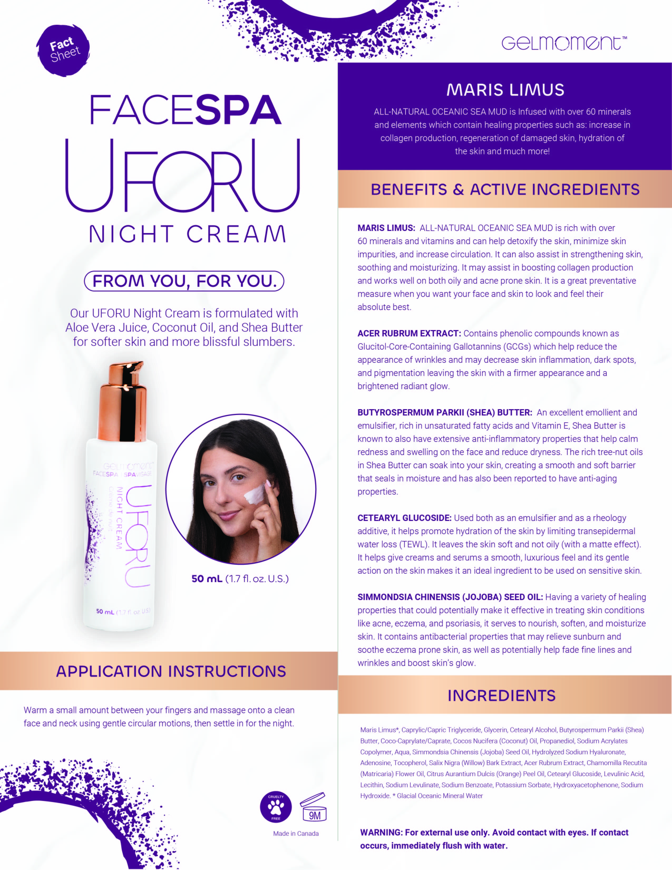 UFORU Night Cream is formulated with Shea butter and offers deep hydration with anti-aging benefits while Jojoba seed oil nourishes the skin and soothes irritation. Let luxury melt into your skin as you drift off into dreamland, and say good morning to a firmer, more radiant complexion.